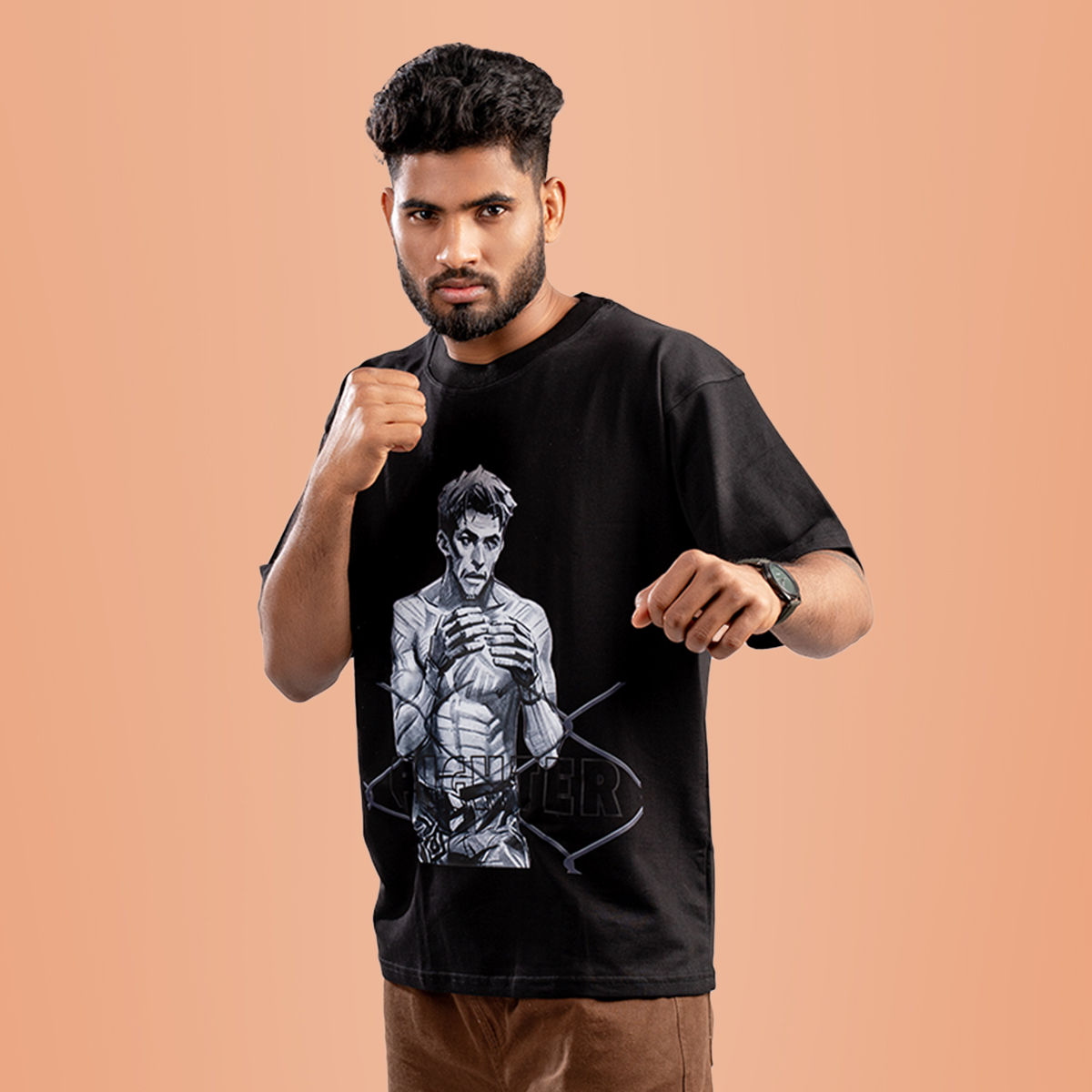 Experience unparalleled comfort and style with our Fighter Oversized drop shoulder Black color digital printed t-shirt, crafted from 100% cotton French terry. At My Site 4, we prioritize quality and authenticity in every piece. This t-shirt offers a relaxed yet fashionable fit, perfect for casual outings or lounging at home. Our commitment to excellence ensures that you receive a product that not only looks good but feels luxurious against your skin. Make a bold statement while enjoying the superior softness and durability that only French terry can provide.